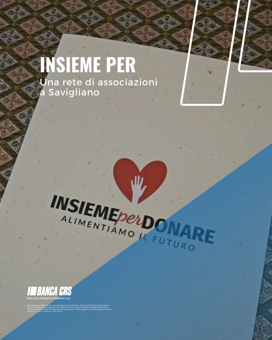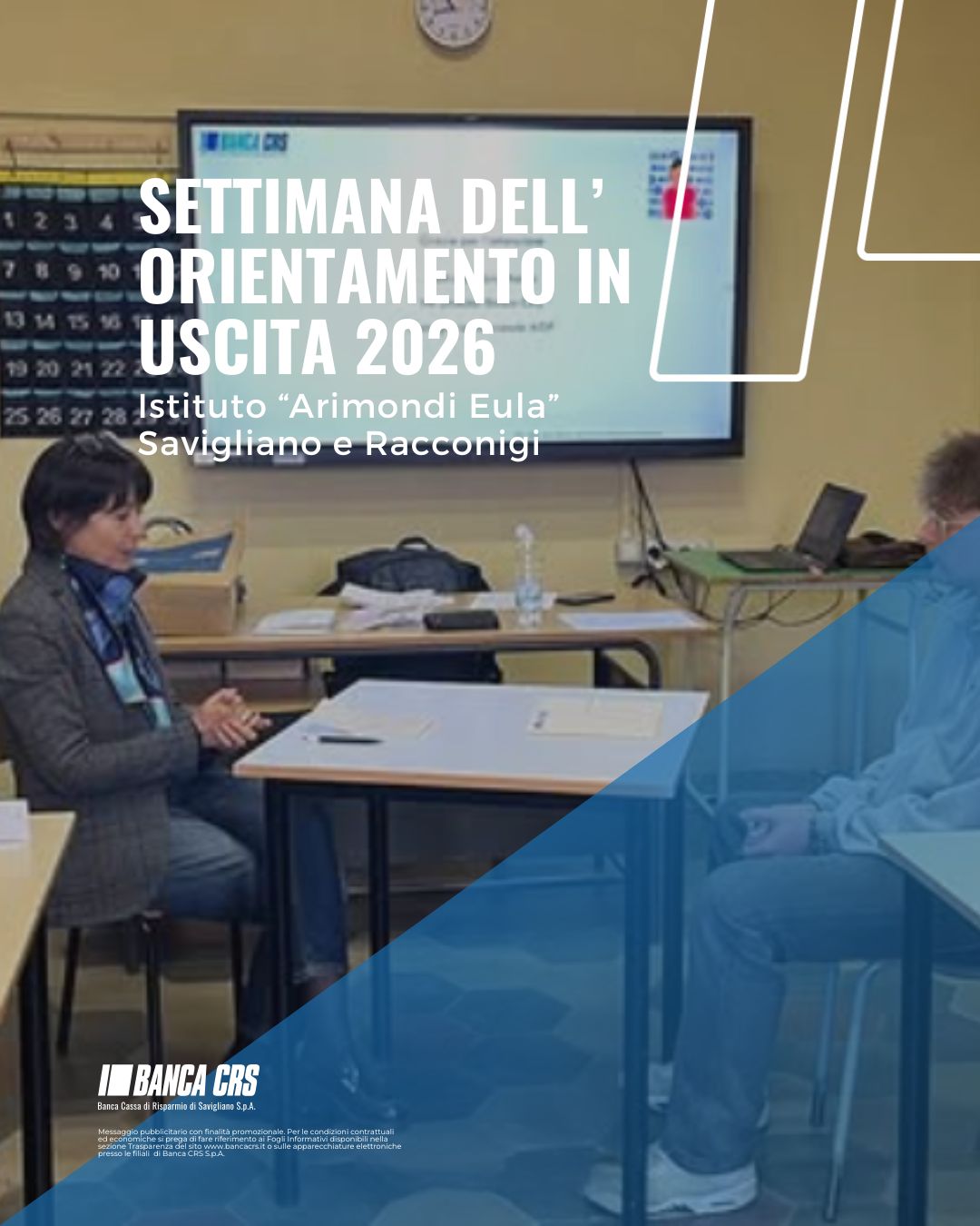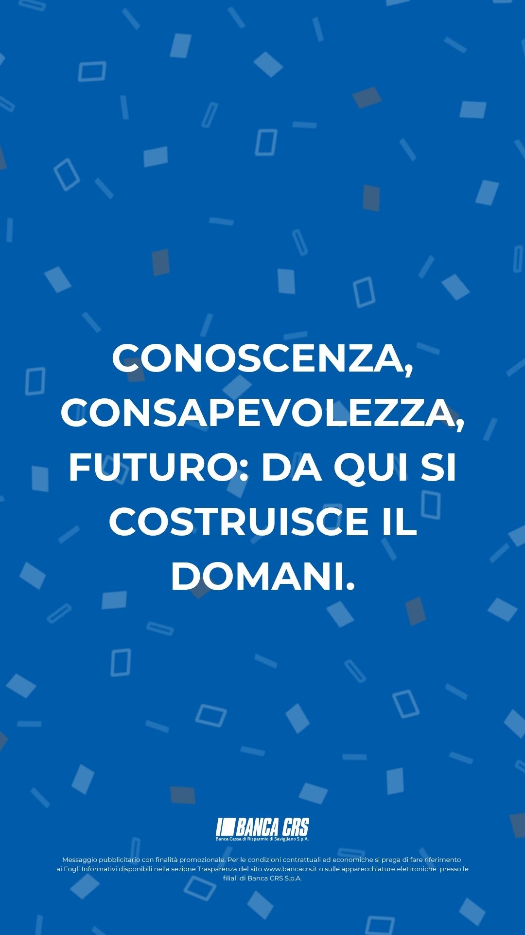 Messaggio pubblicitario con finalità promozionale. Per le condizioni contrattuali ed economiche si prega di fare riferimento ai Fogli Informativi disponibili nella sezione Trasparenza del sito www.bancacrs.it o sulle apparecchiature elettroniche presso le filiali di Banca CRS S.p.A.